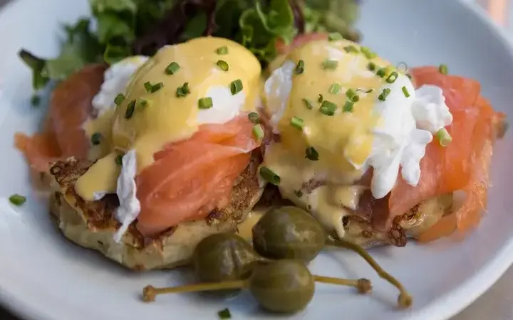 يبدو هذا الطبق للفطور المتأخر مثل البيض بنديكت التقليدي، ولكن تم استبدال المافن الإنجليزي بشرائح من الخضروات المحمصة المقرمشة. مع بقاء البيض المسلوق وصوص الهولنديز واللحم المقدد والخضار في مكانه، يحتفظ بالراحة الأصلية مع إضافة قرمشة خفيفة وأكثر حدة.