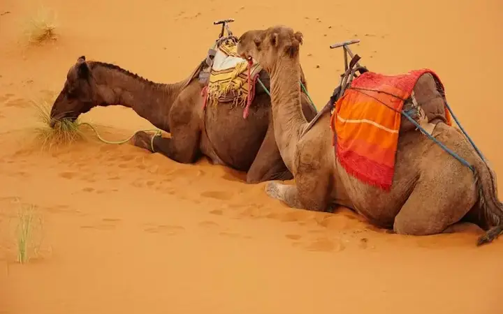 تبدو ركوب الجمل أصعب ما تكون حين ينهض الحيوان، لا حين تصعد عليه. والحيلة بسيطة: مِل إلى الخلف عندما ترتفع مؤخرتُه، ثم إلى الأمام عندما يرتفع مقدَّمه، وحافظ على ارتخاء جسمك حتى تبدو هذه الدفعة الغريبة قابلة للتعامل بدلًا من أن تكون مقلقة.
