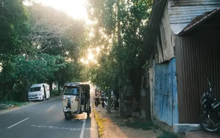 تبدو هذه التوك توك السريلانكية أقل شبهاً بوسيلة نقل بسيطة وأكثر قرباً من مركبة خدمية مجتهدة. فحمولتها فوق السقف، وإمكانية الوصول المفتوحة من الجانب، ووقوفها على جانب الطريق تشير إلى أنها تنقل معدات، وتؤدي مهام متعددة، وتواصل عملها بهدوء حتى في هذا المشهد الساحلي الخلاب.