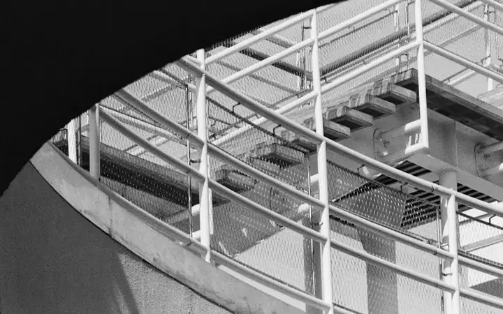 يصبح سطح أحد مباني المدينة أكثر من مجرد خلفية حين تلاحظ ما هو مُثبت عليه: هوائيًا لوحيًا لتغطية واسعة، وطبق ميكروويف لوصلات نقطة إلى نقطة، ونصف قمر يعلوهما معًا. وهكذا يحوّل المشهد معدات الاتصالات العادية إلى تباين لافت بين البنية التحتية والسماء.