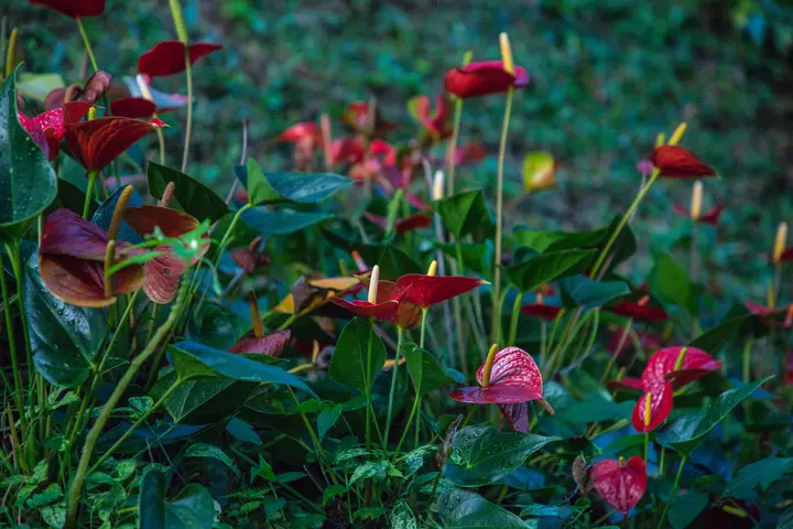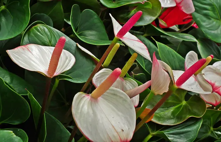 2- الأنثوريوم ذو الزهور المتعددة: هذه الأصناف تأتي بزهور تحمل تدرجات متعددة من الألوان في نفس الزهرة، مما يخلق مظهرًا ساحرًا وفريدًا. يمكن أن تجمع بين الألوان الزاهية مثل الأحمر والأصفر والوردي لتضفي لمسة من الحيوية والجمال على أي منزل.