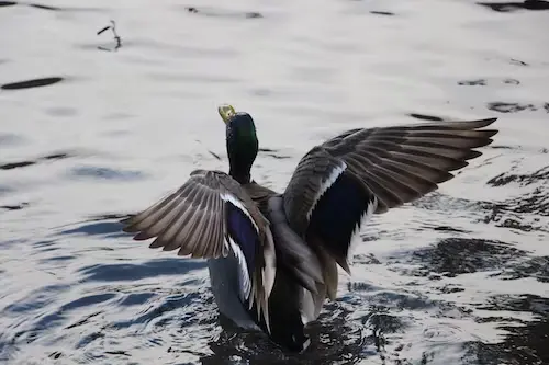 عندما نلقي نظرة على ريش بطة الماندرين، نرى مجموعة متنوعة من الألوان تنتشر على جسدها بشكل جذاب وأنيق. تتميز برأس ذو لونٍ بنفسجي غامق يتدرج إلى اللون الأبيض في الجزء السفلي من الرقبة لتشكل قناعا جماليا يزيد من جاذبية مظهرها. أما الريش الجانبية فتتميز بتصميم فريد يدمج بين الألوان الزرقاء والخضراء اللامعة، مما يخلق تأثيرا بصريا رائعا عند تحريكها. ولا يمكن إغفال جمال الريش الذيلي البنفسجي الذي يبرز بريقا استثنائيا في أرجاء المناظر المائية.