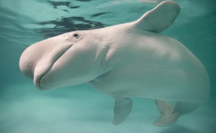 بلإضافة إلى ذلك، تعتبر الحيتان البيضاء فريدة من نوعها بلونها الأبيض النقي الذي يعد من معالمها المميزة. ويتسم لونها الأبيض الناصع بالجمال والسحر، ويمنحها مظهرًا متألقًا في المياه الزرقاء العميقة. يتميز جسمها أيضًا بقشور صغيرة تغطيها تعطيها مظهرًا لامعًا.