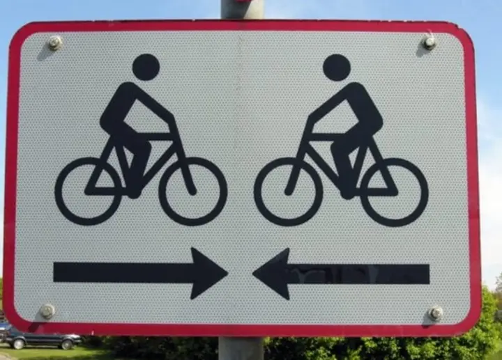 عندما تقود سيّارةً، قد لا تكون هذه الإشارةُ مثيرةً للقلق. ومع ذلك، على الدراجة، يبدو أن هذه الإشارة قد تُبطِئك. هل هذه تعليمةٌ لمراقبة سائقي الدراجات الهوائيّة المُنافسين؟ أم هي دعوة إلى لعبة الدجاج الخطيرة (التي يسير فيها سائقان باتّجاه بعضهما البعض ومنْ يُغيِّر طريقَه أوّلاً يُنعَت بالجبن كدجاجة)؟