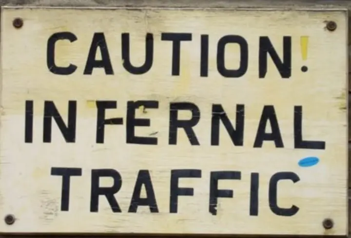 قد تكون هذه الإشارةُ ("نقل جهنّمي" بدلا من "نقل دوليّ"، بسبب حذف قسمٍ من حرف) بمثابة نسمةٍ من الهواء النقي إذا لفتتْ انتباهَك خلال حركتك البطيئة في زحمةِ سيرٍ خانقة تلاصقت فيها السيّارات أثناء حركةِ مرورٍ كلاسيكية. في ذلك الوقت، قد يبدو أنه لم يَعُد هناك مكانٌ مُمِلّ في العالَم. على الجانب المشرق، قد تكسر هذه الإشارةُ الرتابةَ وتجلب الابتسامةَ على وجهك. هل تساءلت يومًا عن سبب اختلاف أشكال لافتات الشوارع؟ قد تفاجئك الإجابة.