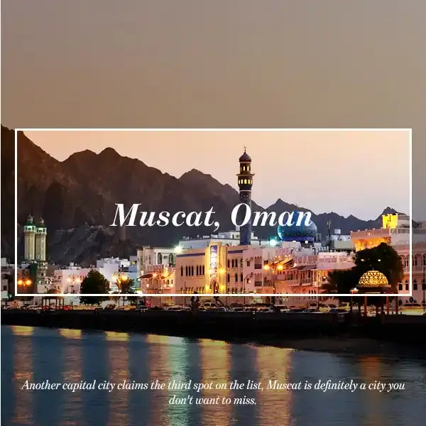 مسقط، العاصمة العمانية، لن تصدق كم يفيض هذا المكان بالسحر والأصالة،حيث يشعر سكان مسقط بأنهم يعيشون في حضن التاريخ والطبيعة، حيث تلتقي الجبال الشاهقة بالبحر الأزرق في مشهد خلاب،و تتسم تلك المدينة العربية الأصيلة بالهدوء والرقي، وتضم معالم ثقافية مثل جامع السلطان قابوس الأكبر وجامع محمد أمين والمتاحف ودار الأوبرا الملكية. في مسقط، يجد المواطن سلامه الداخلي واستقراره بالعيش في بيئة تجمع بين التراث العريق والحداثة المتزنة مع جودة الحياة والرفاهية وأصالة الشعب.