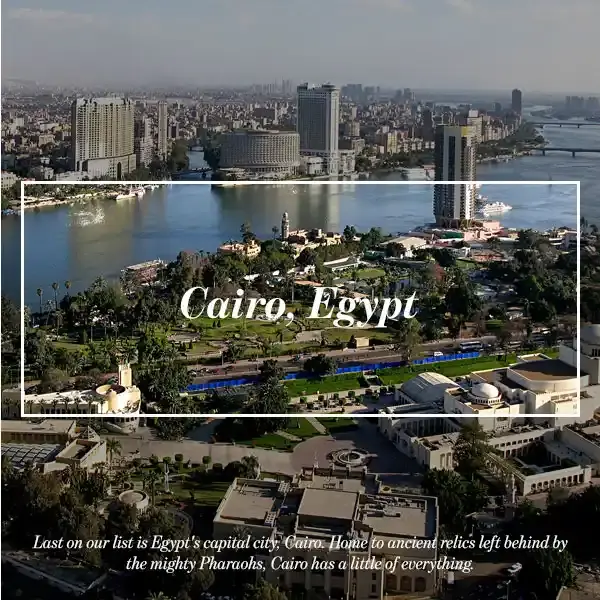 والأخيرة في قائمتنا هي مدينة القاهرة العريقة،حيث يشعر السكان بأنهم يعيشون في قلب الحضارة والتاريخ. تُعد العاصمة المصرية موطنًا لآثار الفراعنة العظماء ومواقع أثرية تجسد عراقة الماضي. يجد المواطن في القاهرة دفء العلاقات الإنسانية والروحانية، مستمتعًا بالحياة وسط مناظر نهر النيل الخلابة وبرج القاهرة الشاهق والمتاحف الممتعة والخدمات المتاحة على مدار الساعة. في هذه المدينة العربية، ومجرد أن تطأ قدماك هذه الساحرة تشعر بأنك وسط نسيج حضاري غني ومتجدد، مما يجعل العيش فيها تجربة فريدة مليئة بالدفء والاحتضان.