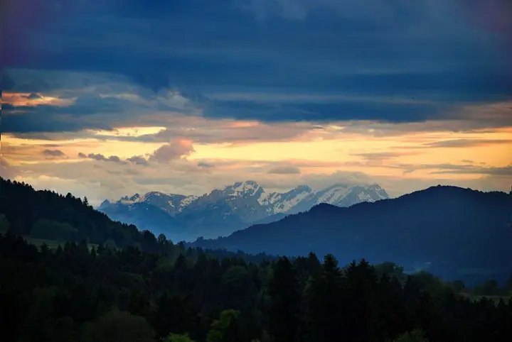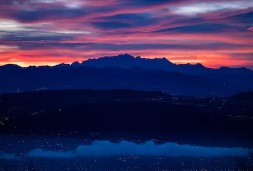 عندما تنخفض شمس الغروب في الأفق البعيد، يبدأ السماء بالتلون بدرجات الأحمر والبرتقالي والأصفر الساحرة. يعكس لون السماء المتغير حلاوة المناظر الطبيعية، حيث تتلألأ خيالات السحب وتتحول إلى ألوان متعددة ومدهشة. ومع مرور الوقت، يتلاشى الضوء الأحمر وتندمج الألوان بألوان الغسق الباهتة، مما يخلق جوًا هادئًا ورومانسيًا يلف الجبال.