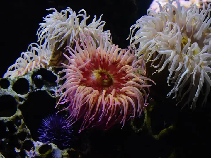 بالاقتراب من حافة المحيط، تزداد عمق البرك ويبدو محتواها أكثر جرأة—شقائق النعمان المفتوحة بأذرع تتحرك برفق، ترحب بخداع بأي مارة صغيرة غير حذر. الأسماك هنا أكثر مراوغة؛ ظلال تهرع إلى الشقوق، تذكرنا بالعمق الذي لا ينتهي خلفها.