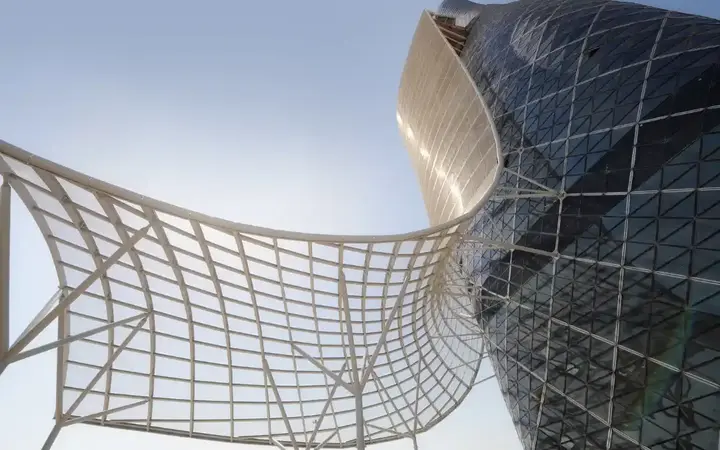 برج بوابة العاصمة في أبوظبي مدهش بميله 18 درجة، مما يجعله أكثر ميلًا من برج بيزا ويدخله موسوعة غينيس. تصميمه مستوحى من البحر والصحراء، ويضم فندقًا فخمًا ومرافق مميزة، ويجمع بين الإبداع المعماري والحلول المستدامة لتقليل استهلاك الطاقة.