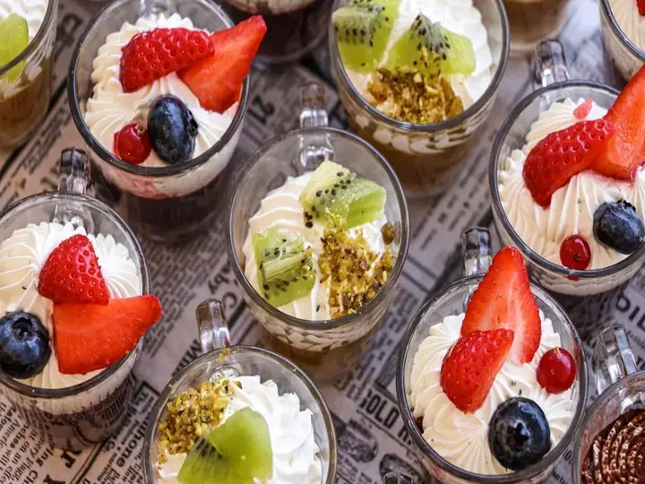 ولا ينبغي أن يكون السطح العلوي مستويًا كأنه غطاء. بل ينبغي أن يكون أكبر قليلًا، بمعنى أن ترتفع الفاكهة والكريمة قليلًا فوق خط الحافة أو تتمددا بما يكفي ليبدوا مقصودين. لا فوضويًا، ولا شاهقًا، بل تاجًا مضبوطًا. فذلك القدر البسيط من العرض الإضافي يوحي للعين بأن الكوب كله مملوء جيدًا، حتى قبل أن تغوص فيه الملعقة.