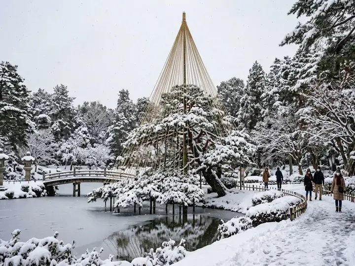 تلك المخاريط الحبلية الشهيرة ليست زينةً للحدائق في الأصل. إنها «يوكيتسوري»، أو دعامات الثلج على طراز yukizuri، وفي كينروكُوين في كانازاوا تُنصَب لمساعدة أغصان الأشجار على ألّا تنكسر تحت ثقل ثلوج الشتاء.