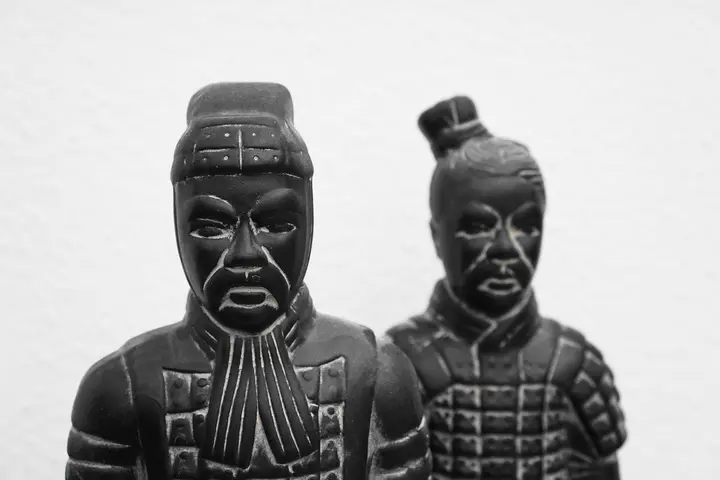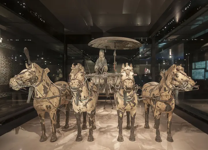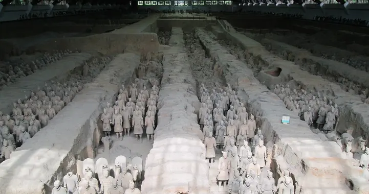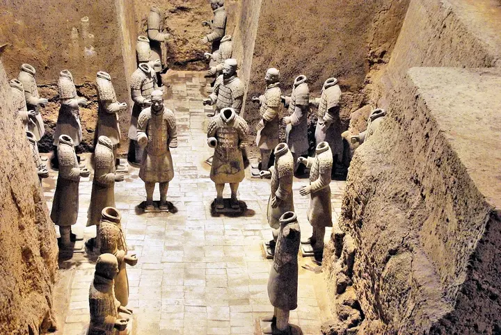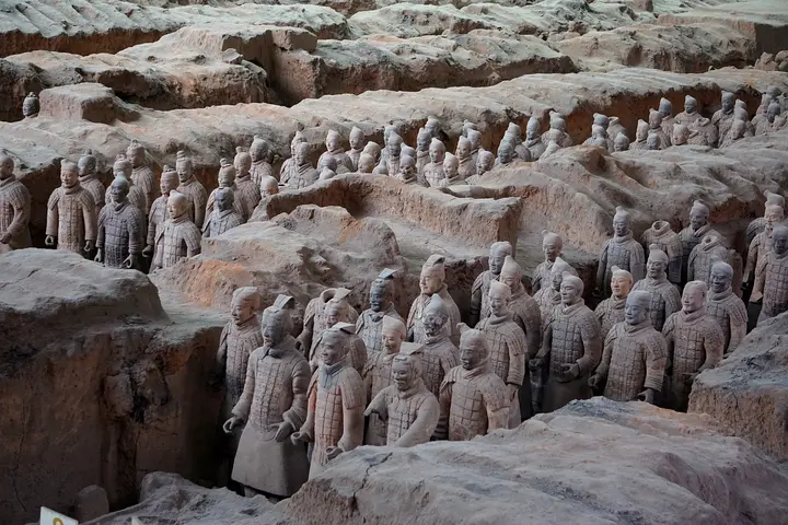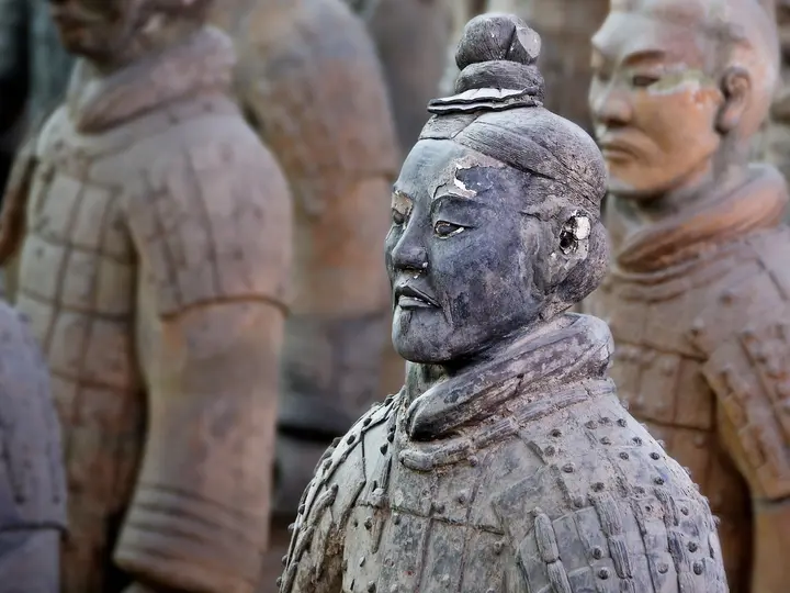 تعتبر تماثيل الجنود والخيول الصلصالية من عهد الإمبراطور قين شي هوانغ، الذي حكم الصين في القرن الثالث قبل الميلاد. تعد هذه التماثيل جزءًا من مقبرته الضخمة، وقد تم اكتشافها في عام 1974. تمثل هذه الأعمال الفنية الحياة العسكرية في الصين القديمة بتفاصيل دقيقة، مما يجعلها مصدرًا قيمًا للمعلومات حول التاريخ والثقافة الصينية.