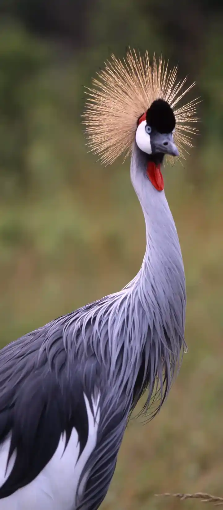 بداية، ستلاحظ على الفور تاجه الذي يضفي عليه مظهرًا مهيبًا وملكيًا. يتكون هذا التاج من ريش رمادي أصفر طويل وجميل ينبعث من قاعدة العنق، ويبرز بشكل أنيق فوق رأسه المستدير. إنه تاج يميزه عن كل الكائنات الأخرى في البراري، ويعطيه هوية فريدة تستحق الإعجاب والإكبار.