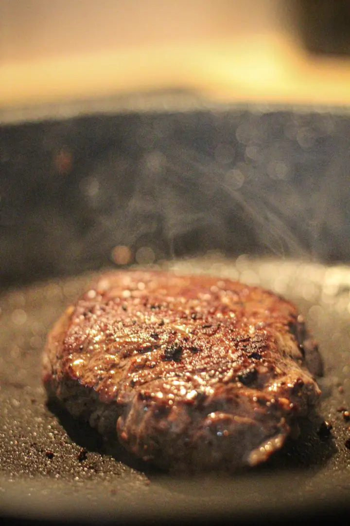 بعد ذلك، قم بوضع الشريحة المُتبَّلة بلطف في المقلاة المسخنة واتركها لبضع دقائق، دون أن تلمسها أو تحركها. هذا سيسمح للشريحة بتكوين قشرة مقرمشة بشكل مثالي وسيحافظ على نكهتها الغنية وعصارتها الداخلية.