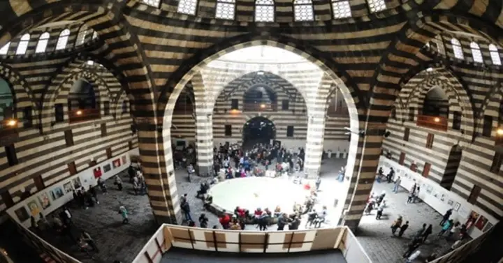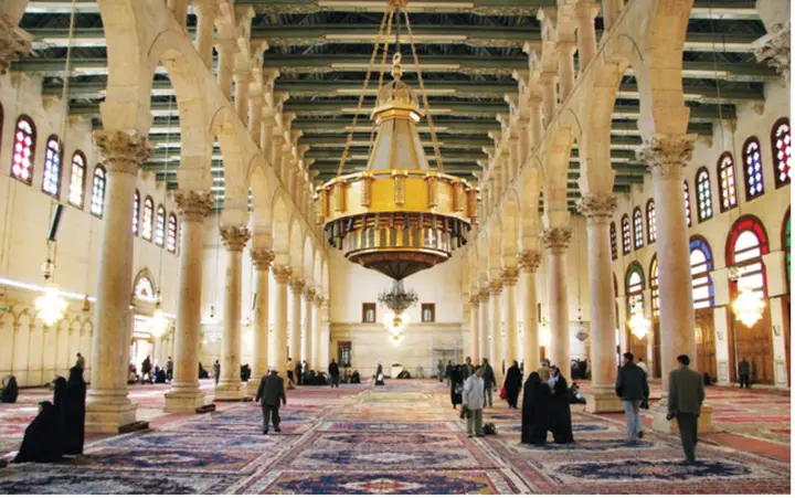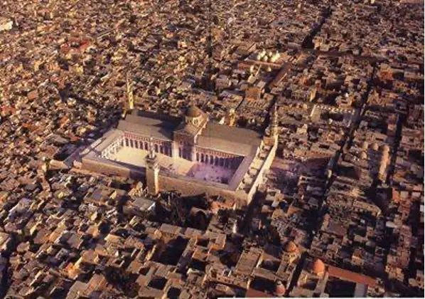 في وسط مركز دمشق القديمة، يقع الجامع الأموي الذي بُني في موقع معبد حدد الذي أصبح معبد الإله جوبيتر أيام الرومان، ومن ثم كنيسة يوحنا المعمدان، وأخيراً الجامع الأموي البديع نتيجة اتفاق بين الخليفة الوليد والمسيحيين. يحد الجامع جنوباً حي البزورية، وغرباً سوق الحميدية، وشرقاً مقهى النوفرة، وشمالاً المدرسة العزيزية وضريح السلطان صلاح الدين الأيوبي. تبلغ مساحة الجامع حوالي 97 * 157 متراً مربعاً، ويقسم إلى قسم الحرم المغطى والفناء المفتوح (صحن الجامع). يشتهر الجامع بمآذنه الثلاث: مأذنة العروس شمالاً؛ مأذنة عيسى شرقاً؛ ومأذنة قيتباي غرباً، وقبة النسر فوق الحرم الذي يحتوي على ضريح النبي يوحنا المعمدان. وتتوزع في الفناء قبة الساعات وقبة الخزنة وقبة الوضوء أو البركة. ولعلّ أبرز جماليات هذا الجامع لوحات الفسيفساء التي تغطي واجهة الحرم وبعض الجدران المطلة على الفناء. وتُمثّل هذه اللوحات مشاهد من الجنة الموعودة. استغرق بناء الجامع الأموي نحو تسع سنوات، وبلغت تكاليف البناء نحو خمسة ملايين وستمائة دينار ذهبي، وهذا ما يكافئ إنتاج الشام سبع سنوات.