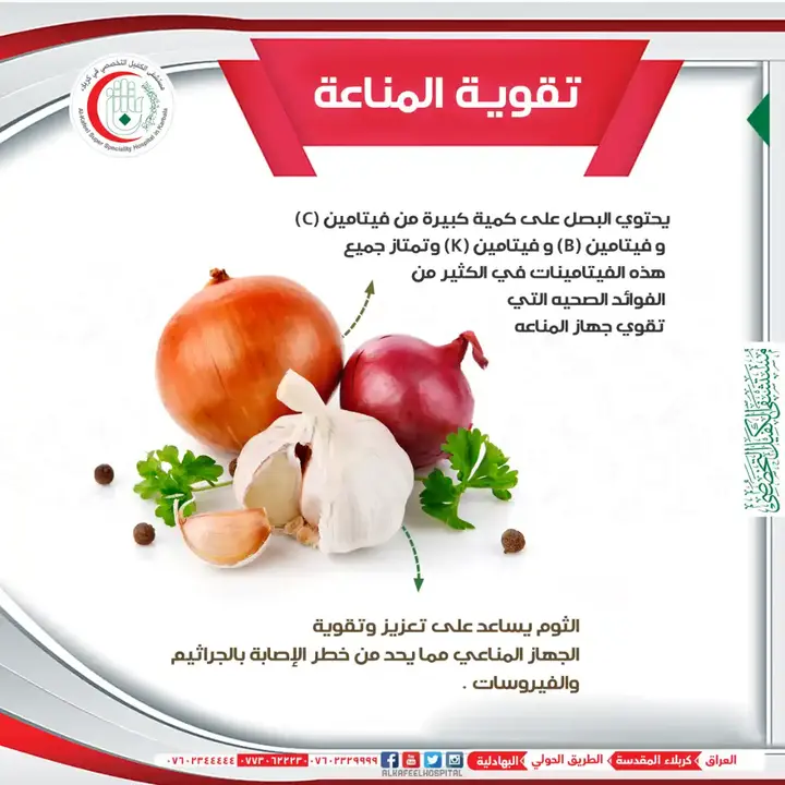 • كل من الثوم والبصل غنيان أيضًا بفيتامين C، الذي يدعم وظيفة الجهاز المناعي الصحي، وشفاء الجروح، وتكوين الكولاجين والأنسجة الضامة.