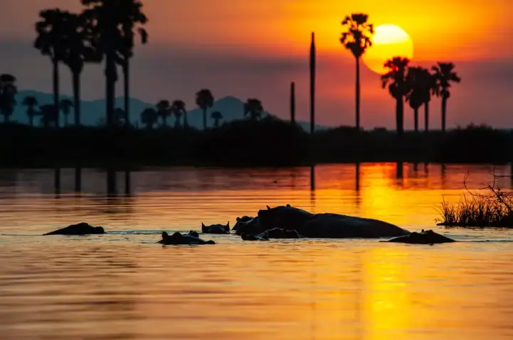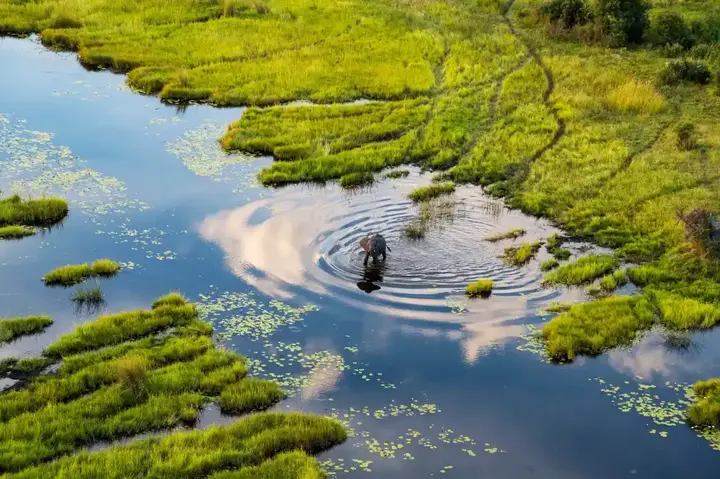 تعد هذه الدلتا الداخلية واحدة من أجمل المناطق وأكثرها ثراءً بالحياة البرية في أفريقيا. تقع في شمال بوتسوانا، وتتغذى على مياه الفيضانات من أنغولا المجاورة بين مايو وأكتوبر. هذا هو الوقت الذي يمكن فيه للزوار استكشاف الممرات المائية المبطنة بالقصب بواسطة موكورو - وهو زورق تقليدي - وهي تجربة خاصة بشكل خاص. يوجد عدد من المحميات في الدلتا والسياحة خاضعة للرقابة بحيث تبدو البرية والبعيدة؛ كما أنها أغلى مكان للذهاب إليه في رحلات السفاري. لكن مشاهدة الحياة البرية استثنائية - فكر في الأسود التي تصطاد الجاموس، والكلاب البرية التي تركض عبر الأدغال، وأفراس النهر التي تبرد في الماء، والأفيال التي ترعى أشجار السنط. وهي وجهة رائعة لمشاهدة الطيور.