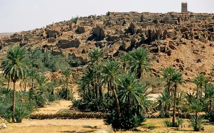 الطبيعة هنا مهيبة، تجمع بين صخور الهضاب الجافة وكثبان الرمال الذهبية، في مشهد يثير التأمل والدهشة. في هذه البيئة القاسية، نشأت مدينة ازدهرت بالعلم والدين والتجارة.