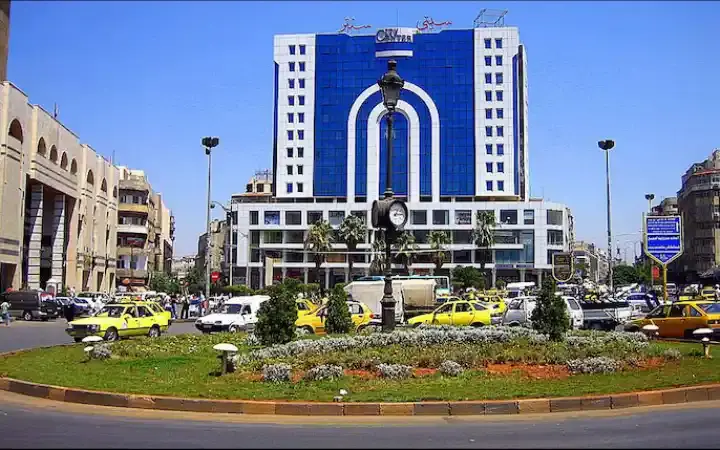 ساحة الشهداء في حمص، سوريا. في وسطها برج الساعة القديم الشهير