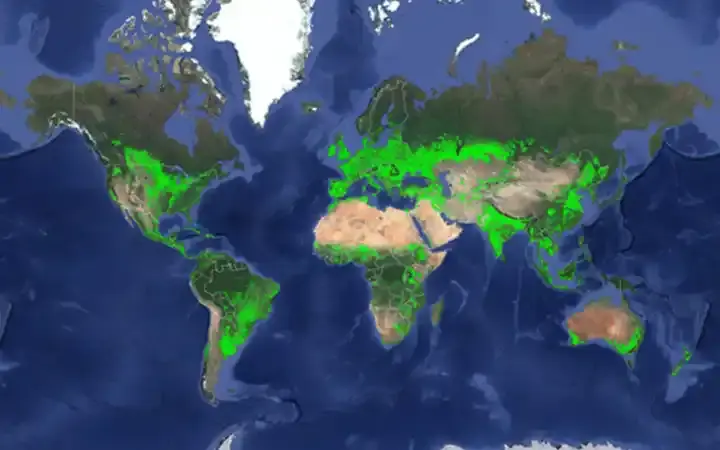 ريطة الأراضي المُخصصة للحبوب: توزيع الأراضي الزراعية حول العالم بدقة اسمية تبلغ 30 متراً، مستمدة أساساً من صور لاندسات