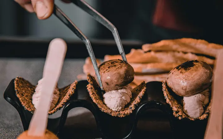 يُقدّم الفطر المحشو في طبق تقديم أنيق، ويمكن تزيينه بأوراق الأعشاب الطازجة. هذا الطبق مثالي للعزومات الرسمية لما يتمتع به من مظهر جذاب وطعم غني.