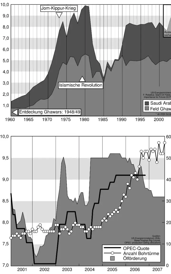 إنتاج المملكة العربية السعودية الكلي وإنتاج حقل الغوار. الصورة السفلى: مقارنة بين كمية استخراج النفط وتزايد عدد الآبار في المملكة العربية السعودية