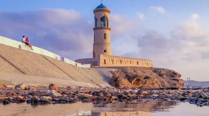 • التصميم الحالي للمنارة يتميز بثلاثة طوابق وسقف مقبب وزخارف تعكس العمارة العمانية التقليدية.
