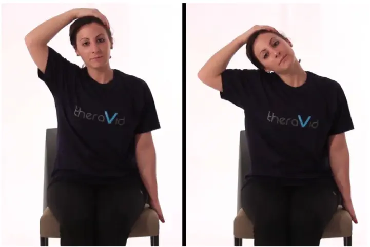 الطريقة: قم بمدّ ذراعك الأيمن إلى الأسفل وامسك بجانب كرسيك. قم بإمالة رأسك إلى اليسار حتّى تشعر بتمدّد لطيف على جانب رقبتك. استمر في هذا الوضع لمدة 15 إلى 30 ثانية ثم كرر ذلك على الجانب الآخر.