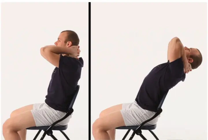 الطريقة: اجلس في كرسيّك مع تجليس ظهرك بشكل مريح على مسند الظهر. ضع راحتي يديك على مؤخرة رقبتك. استند إلى مسند ظهر الكرسيّ مع إبقاء مرفقيك واسعين حتى تشعر بتمدّد لطيف على الظهر والصدر. استمر في هذا التمدّد لمدة 10 إلى 15 ثانية.