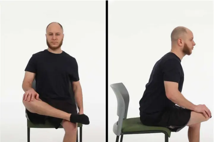 الطريقة: أثناء الجلوس، ضع كاحلك الأيمن فوق ركبتك اليسرى. اجلس في وضعيّة قائمة، وابدأ بالانثناء إلى الأمام من الوركين حتى تشعر بالتمطيط في عضلات الردف الأيمن. يمكنك الضغط على ركبتك اليمنى للمساعدة في تعميق التمدّد. استمر في هذا الوضع لمدة 15 إلى 30 ثانية ثم كرر ذلك على الجانب الآخر.