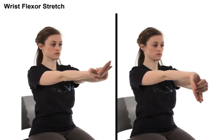 الطريقة: مدّ ذراعك اليمنى مباشرة أمامك مع وضع راحة يدك نحو الأعلى. قم بثني معصمك حتّى تصبح أطراف أصابعك موجّهة نحو الأرض. باستخدام يدك اليسرى، اسحب أصابعك للخلف لتعميق التمدّد حتى تشعر بتمدّد في ذراعك. استمر في هذا الوضع لمدة 15 إلى 30 ثانية ثم كرر ذلك على الجانب الآخر. كرّر هذا التمرين مع توجيه راحة يدك للأسفل وثني الأصابع للأعلى.