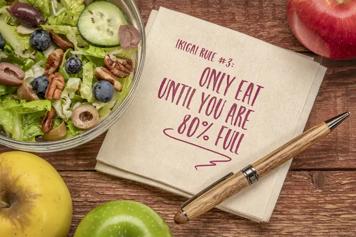 هذه التقنية هي المفهوم العملي للتوقف عن الأكل عند الشبع بنسبة 80%، بدلاً من 100%. يعتمد ذلك على فكرة أنه إذا تناولت طعامًا أكثر من اللازم، فمن المرجح أن تشعر بالكسل أو الخمول. نحن نكيّف هذه التقنيّةَ لتعنيَ مراعاةَ خياراتِ الطعام وكمياتِه والبحثَ عن الأطعمة التي تدعم الطاقة أثناء النهار والراحة والهدوء في المساء.