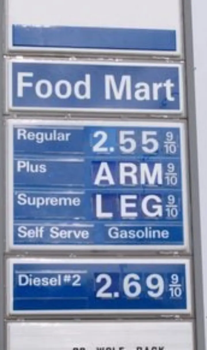 لا أعرف عنكَ، لكني أعتقد أنني سأعود وأحصل على الغاز فقط لتكريم الضحكة الخافتة التي شعرت بها عند قراءة هذه اللافتة. تتقلّب أسعار الغاز، ولكن بغض النظر عن السعر، يبدو دائمًا باهظًا بعض الشيء. لكن في هذه الحالة، الصدقُ والأمانةُ هما اللذان ينتصران. ما الذي ستضحي به للانتقال من النقطة أ إلى النقطة ب؟ سأفكر في ذراع واحدة أو ساق واحدة، لأنه بعد ذلك، لدينا اثنتان من كلّ منهما!