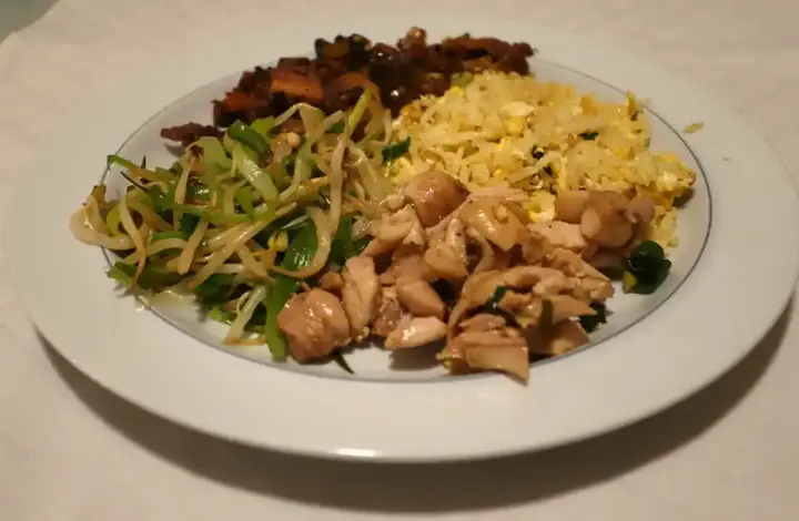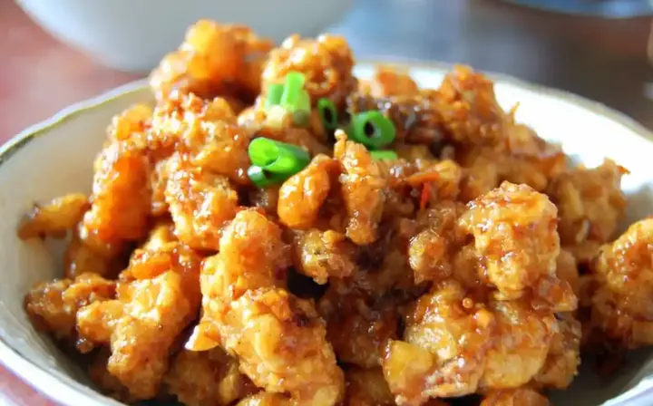 يُنقَع الدجاج طوال الليل في صلصة الصويا الداكنة والبهارات الخمس، ثم يُقلَى بالغمر في الزيت حتى يصبح لونه بلون الكستناء الساخنة المقرمشة. إضافة طعم الحموضة من الزنجبيل والليمون هي أمرٌ لا بدّ منه هنا، كما أنَّ النكهات ثنائية القومية لصلصة المحار الصينية وصلصة الفلفل سكوتش بونيه تُكمل الطبق.