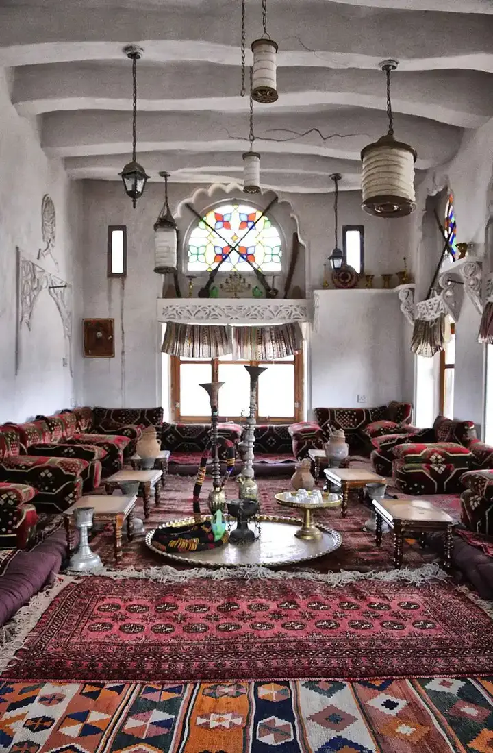 داخل البيوت، تُستخدم النقوش لتحديد الفضاءات وإضفاء الدفء والحميمية على الأماكن العامة والخاصة. الألوان الزاهية والتصاميم المعقدة تُستخدم لتزيين القاعات والغرف، مما يُعطي كل مساحة طابعًا فريدًا. وتُعد القمريات، بنقوشها الخشبية الرائعة، عنصرًا مميزًا في الديكور الداخلي، حيث تُسهم في توزيع الضوء وخلق أجواء ساحرة داخل البيوت.