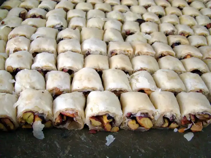 البقلاوة، هذه الحلوى الشهيرة التي تُعتبر من روائع المطبخ الدمشقي، تتميز بطبقاتها الرقيقة والمقرمشة من عجينة الفيلو وحشوتها الغنية بالمكسرات والقطر الحلو. تُعد البقلاوة من الحلويات الفاخرة التي تُقدم في المناسبات الخاصة والأعياد.