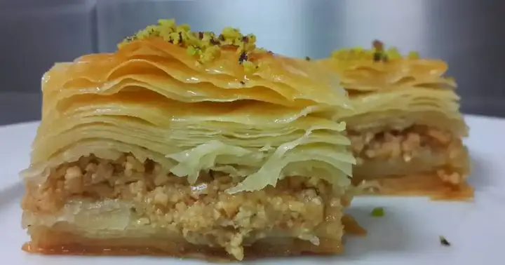 المكونات والتحضير: تُصنع البقلاوة من عجينة الفيلو الرقيقة، التي تُدهن بالسمن بين كل طبقة وطبقة، وتُحشى بمزيج من المكسرات المفرومة مثل الجوز أو الفستق الحلبي. بعد الخبز، تُسقى البقلاوة بالقطر لتُضفي عليها الحلاوة واللمعان.