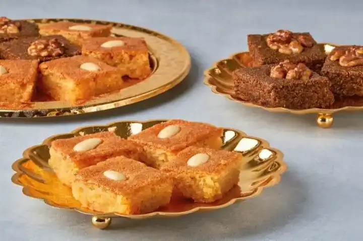 المكونات والتحضير: تُصنع النمورة من السميد المخلوط مع السكر والسمن واللبن، وتُخبز في الفرن حتى تأخذ لونًا ذهبيًا. بعد الخبز، تُسقى بالشيرة الساخنة، وهي مزيج من السكر والماء وعصير الليمون، مما يمنحها رطوبة ونكهة مميزة. يُمكن تزيينها باللوز أو الفستق الحلبي لإضافة مظهر جذاب ونكهة إضافية.