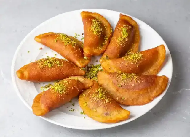 المكونات والتحضير: تُصنع القطايف من عجينة خاصة تُشبه عجينة البانكيك، وتُحشى بالقشطة أو المكسرات حسب الرغبة. بعد الحشو، تُقفل القطايف على شكل نصف دائرة وتُقلى أو تُخبز حتى تصبح ذهبية اللون. ثم تُغمس في القطر أو تُرش بالسكر الناعم.