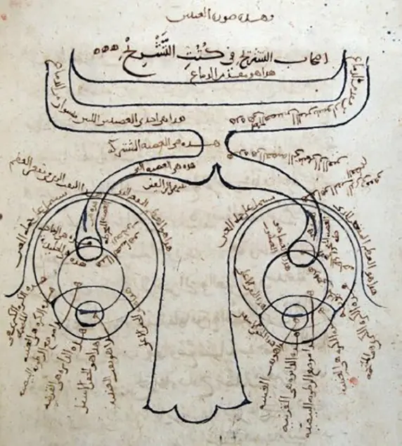 لكنه أدرك أن دخول الضوء إلى العين ما هو إلا الخطوة الأولى في الرؤية. لقد بنى على عمل الطبيب اليوناني جالينوس الذي قدم وصفًا تفصيليًا للعين والممرات البصرية. اليوم أقدم رسم معروف للجهاز العصبي هو من كتاب البصريات لابن الهيثم، والذي يوضح العيون والأعصاب البصرية.