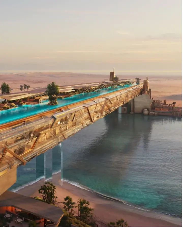 وسط المناظر الطبيعية الخلابة في خليج العقبة في المملكة العربية السعودية، تظهر واحة رائدة من الفخامة، مستعدة لإعادة تعريف جوهر الحياة في المنطقة. يُعدّ منتجع تريام، الذي طورته NEOM ، تجربةً لا مثيل لها حيث يلتقي البذخ بالإشراف البيئي. في قلب هذا المشروع الخيالي تكمن أعجوبة معمارية: أطول حوض سباحة لا متناهٍ في العالم يقع فوق جسر. هذا المنتجع ليس مجرد وجهة، بل هو شهادة على التعايش المتناغم بين الطبيعة والابتكار البشري. بفضل التزامها بالاستدامة البيئية والمحافظة عليها، تقدم تريام للضيوف فرصة للاستمتاع بالرفاهية دون المساس بقيمهم. ومع تقدم أعمال البناء، يتزايد الترقب لملاذ استثنائي يمزج بسلاسة بين البذخ ومسؤولية المحافظة على البيئة.