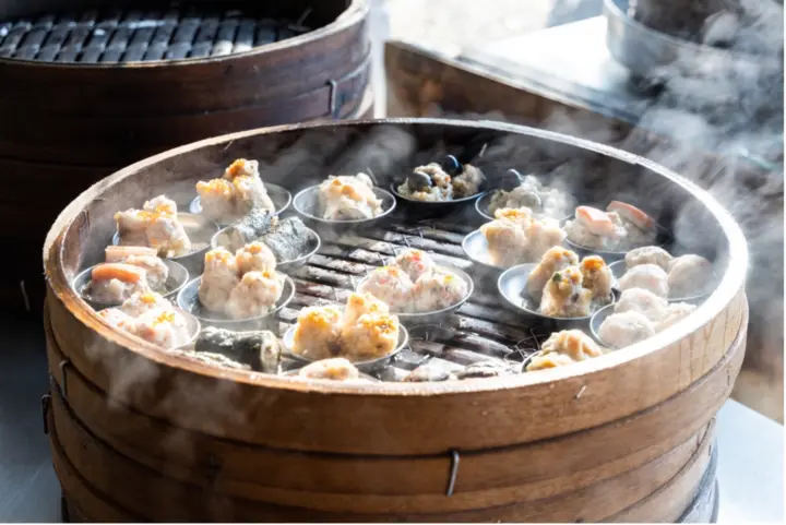 الطهي بالبخار يُستخدم للمكونات الرقيقة مثل السمك والخضروات والزلابية. يُحافظ على النكهات الطبيعية والمغذيات، ويُعتبر أسلوبًا صحيًا للطهي.