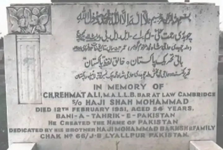 شودري رحمت علي، مفكر بارز وشخصية مؤثرة في الحركة الباكستانية، عبّر لأول مرة عن فكرة الدولة الإسلامية المنفصلة في كتيبه الذي صدر عام 1933 تحت عنوان "الآن أو أبداً؛ هل سنعيش أم نهلك إلى الأبد؟" وقد أثّرت كتاباته، بالإضافة إلى كتابات مؤلفين آخرين، في تشكيل الدولة وكانت محفّزًا كبيرًا. في البداية اقترح اسم "بانجيستان" لدولة مسلمة في منطقة البنغال، و"عثمانستان" لوطن إسلامي في منطقة الدكن. في عام 1930، انتقل شودري رحمت علي إلى منزل في كامبريدج. ويقال إنه كتب كلمة "باكستان" لأول مرة في إحدى غرف هذا المنزل. هناك عدة روايات عن إنشاء الاسم. وفقًا لصديقه عبد الكريم جبار، فقد ظهر الاسم عندما كان علي يسير على ضفاف نهر التايمز في عام 1932 مع أصدقائه، ووفقًا لسكرتيرته، فقد جاء بالفكرة أثناء ركوبه في حافلة في لندن.