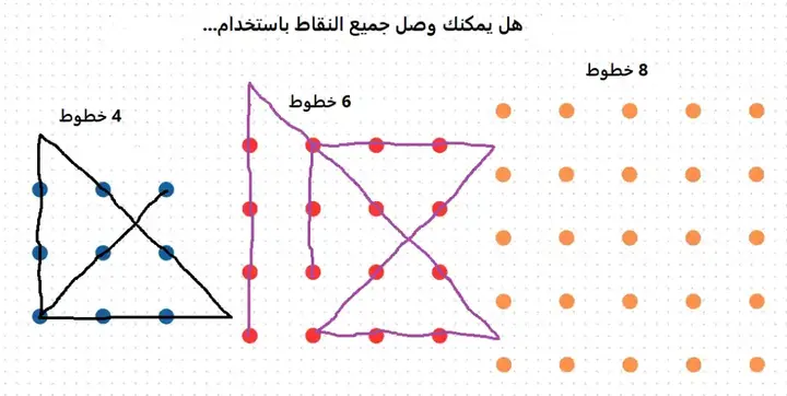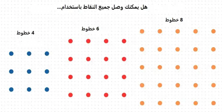 حول هذه النقطة الأخيرة يتمحور اللغز المقدّم اليوم. هناك 3 مستويات لهذا اللغز. في كل مستوى منها، يجب عليك توصيل جميع النقاط الـ 9 و 16 و 25 أدناه عن طريق رسم 4 و 6 و 8 خطوط مستقيمة تمر عبر كل نقطة من النقاط التسع دون رفع القلم عن الورقة. فكّر قبل مشاهدة الحلّ في الصفحة التالية.