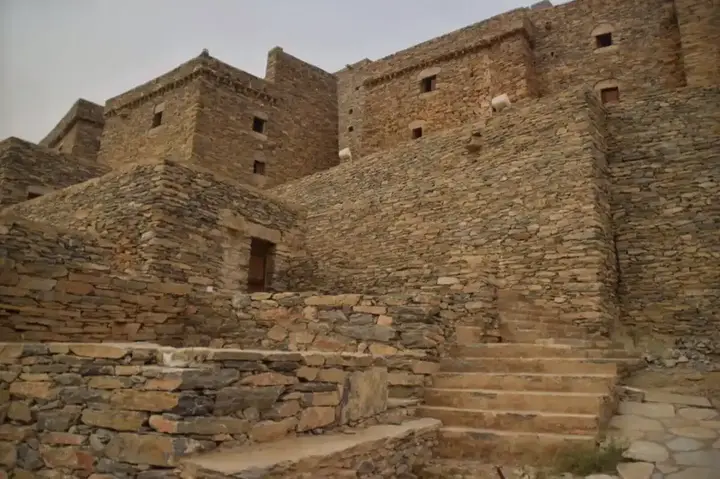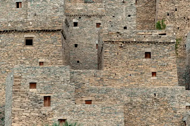 تم بناء هذه المساكن من الطوب الطيني والصخور البركانية وتم تثبيتهم بالطين، كما استخدم خشب السدر لبناء بعض أسقف هذه المباني. يوجد أيضا بقرية ذي عين مسجد بالإضافة إلى حصن كبير كان يستخدم سابقا في الدفاع عن القرية وحمايتها.