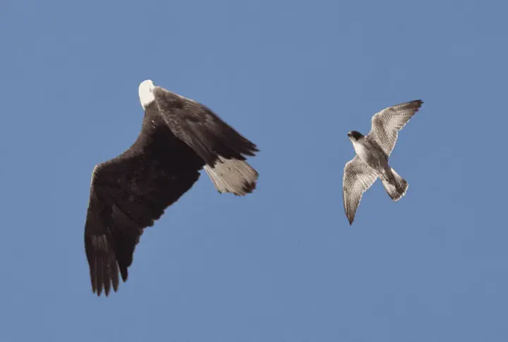 من المحتمل أنه بسبب الاختلافات في سلوك الصيد والنظام الغذائي، يمكن أيضًا التمييز بين الصقور والنسور من خلال نمط الطيران. نوعًا ما. تشتهر النسور بالتحليق عالياً في السماء. تدور وتنزلق، بينما تستخدم بصرها المذهل للبحث عن الفريسة. تشتهر الصقور برشاقتها المذهلة. عادةً ما تظهر سلوكيات الغوص والانقضاض أكثر من التحليق أو الانزلاق. عند رفرفة أجنحتها، تظهر النسور رفرفات بطيئة وثابتة. في حين تميل الصقور إلى رفرفة أجنحتها بسرعة أكبر وتغيير الاتجاه في كثير من الأحيان. بالطبع، هناك استثناءات. جميع الصقور تقريبًا حريصة على الانزلاق والتحليق. وخاصة صقر النانكين من أستراليا، والذي يشتهر باستخدام جيوب الهواء الحراري للتحليق شبه الثابت فوق الحقول. جميع أنواع الصقور أصغر من النسور، لذلك يمكنك عادةً التعرف عليها بهذه الطريقة. أخبرني أحد مراقبي الطيور منذ سنوات أنه يمكن التعرف على الصقور أيضًا من خلال سرعتها المذهلة. هذا ليس صحيحًا تمامًا. الصقر الشاهين هو أسرع حيوان حي على وجه الأرض. يمكنه الغوص حتى 200 ميل في الساعة (320 كم). ولكن مرة أخرى، تم تسجيل هذه السرعة أيضًا لأسرع نسر، النسر الذهبي. ليس مفيدًا للغاية، لكنه لا يزال مثيرًا للإعجاب حقًا!
