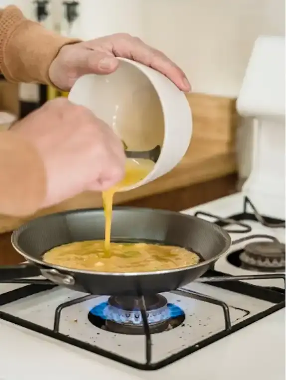 5- اخفق البيض والكريمة (في حالة استخدامها)، واسكبهما في المقلاة. اسحب حواف المزيج نحو الخارج للسماح للبيض بالوصول إلى قاع المقلاة. كرّر ذلك حول الحواف حتى تنتهي من العجة بأكملها عدة مرات ويبدأ الجزء السفلي بالتماسك، لمدة 5 دقائق تقريبًا. رشّ فوقها الملح والفلفل.