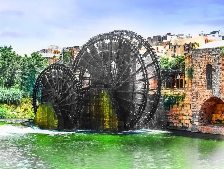 حماة مدينة سورية قديمة تقع على ضفاف نهر العاصي، وتعرف أيضاً بمدينة الجغرافي أبو الفدا (1273 – 1331م)، الذي حكمها من عام 1310م إلى عام 1331م. وكثيراً ما يطلق على حماة اسم "مدينة النواعير"، وذلك بسبب كثرة النواعير الموجودة فيها. ففي غضون كيلومترين، تنتشر 16 نواعير على طول النهر. وتروي هذه النواعير الحقول على جانبي النهر، وتخلق ضفة واسعة للنهر في العديد من الأماكن. وتتغذى النواعير بالطاقة الكهرومائية للنهر. وتغوص عجلات النواعير الخشبية في قاع النهر. ولتسريع دورانها، تُبنى سدود مائلة صغيرة أمامها. وتعمل هذه السدود على إبطاء سرعة المياه، وتسمح لها بالتدفق بسرعة إلى ما يسمى بالخلجان. وتضرب المياه الدلاء الفردية بقوة، بحيث تدور عجلات المياه الكبيرة وتحمل المياه إلى الأعلى في دلاء. وبمجرد وصولها إلى أعلى نقطة، يتم تفريغ الدلاء في أنابيب مياه مفتوحة كبيرة (جسور). ثم تقود هذه الجسور المياه إلى الحقول الأعلى. يتراوح حجم نواعير حماة بين 5 و 12 مترًا في القطر. يحتوي كل دولاب على ما بين 50 و 120 دلو ماء. يصل قطر أكبر دولاب ماء على نهر العاصي إلى 22 مترًا وأطلق عليه سكان حماة اسم المحمدية. خلصت دراسة أجريت عام 1930 إلى أن دولاب دلو ماء واحد يمكنه نقل 45 لترًا من الماء في الثانية بأقصى طاقته. هذه الكمية من الماء كافية لري 25 هكتارًا من الأراضي الصالحة للزراعة. من أجل الحفاظ على الأداء السلس والفعال للدواليب المائية، يجب صيانتها كل عامين، وإذا لزم الأمر، استبدال بعض صناديق المياه. المصطلح الفني لهذا العمل الصيانة الدورية هو "القشطة"، مما يعني إزالة جميع الأجزاء الخشبية. يمكن أن يتكون نظام العجلة المائية من عجلة واحدة أو عجلة مزدوجة، والتي تتضمن عجلتين خشبيتين مثبتتين في السد المائي الصغير. في بعض الأحيان توجد عجلات مائية على الضفتين المتقابلتين لضمان أفضل استخدام للطاقة الكهرومائية التي تولدها السدود الصغيرة. إذا كان هناك أكثر من ثلاث عجلات مائية على نفس السد، يطلق عليها بطارية. تنقسم العجلات المائية إلى فئتين وفقًا لوظيفتها: