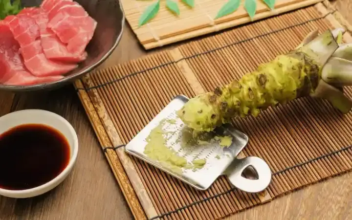 الوسابي نبات يشبه إلى حد كبير الفجل الحار، وكلاهما ينتمي إلى عائلة الكرنبيات. ومع ذلك، فإن الوسابي الياباني، وهو نوع أصلي، أكثر عطرية وحلاوة قليلاً مقارنة بالفجل. تتطلب زراعته التحكم الدقيق في درجة الحرارة، مما يجعل زراعته صعبة حتى في اليابان. بفضل نكهته الحارة المنعشة، يعد الوسابي من التوابل الأساسية للساشيمي والسوشي والسوبا. وبينما يمكن استخدام مبشرات معدنية لتحضيره، فإن الطريقة التقليدية تتضمن استخدام مبشرات مصنوعة من جلد سمك القرش للحصول على ملمس أنعم. يصل الوسابي المبشور حديثًا إلى ذروة نكهته بعد حوالي 1-4 دقائق من بشره ومن الأفضل الاستمتاع به في غضون 10 دقائق. ونظرًا لتكلفته وقصر مدة صلاحيته، نادرًا ما يتم استخدام الوسابي الطازج في المنزل أو حتى في المطاعم ما لم تكن قريبة من مناطق إنتاج الوسابي. إن الحرارة المنعشة التي يتمتع بها الوسابي لا تعزز نكهة الأسماك النيئة فحسب، بل إنها توفر أيضًا خصائص مضادة للبكتيريا، مما يجعلها خيارًا طبيعيًا لمنع التسمم الغذائي عند تناول الأسماك النيئة. لقد أذهلنا حقًا حكمة أسلافنا في فترة إيدو، الذين استخدموا الوسابي مع السوشي لمنع التسمم الغذائي، حتى في غياب تكنولوجيا التبريد.